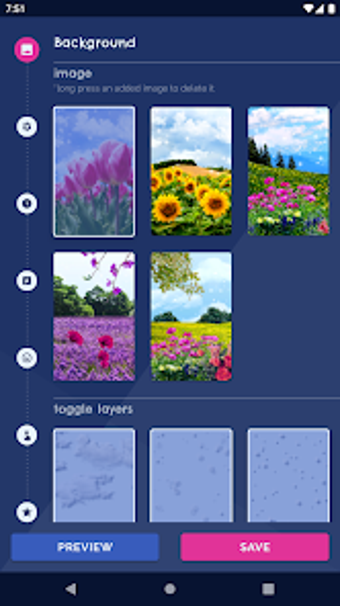 该应用程序提供了许多不同的壁纸和背景,例如紫色、黄色和绿色的图像,以及各种夏季花卉和风景。甚至还有4D壁纸和视差壁纸,这会给您的屏幕和应用程序带来很酷的效果!您可以选择照片或图片作为您的背景,并可以将各种不同的时钟、框架、表情符号、魔法触摸、粒子等添加到背景中。